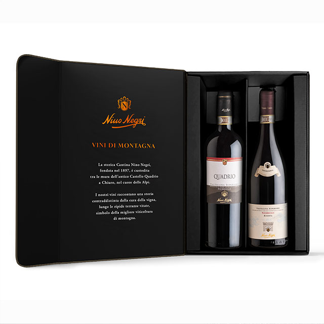 Uve Nebbiolo - Fermentazione a temperatura controllata - Affinano in legno e bottiglia: Quadrio per 2 anni, Riserva per 4 anni - Capacità: 2 bottiglie da 75 cl - Annata: secondo disponibilità