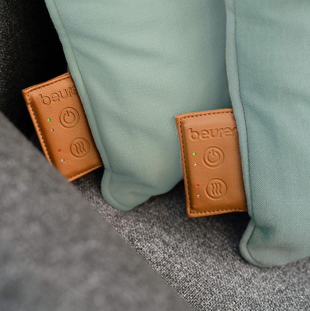 Dimensioni: 40x11x40 cm (LxPxH) - Batteria ricaricabile - 4 testine shiatsu - Funzione calore - Imbottitura in materiale riciclato - Fodera lavabile in lavatrice a 30 °C - Doppia faccia: grigio e salvia