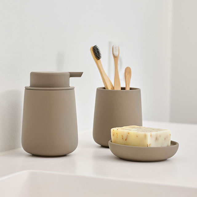 Il marchio Zone Denmark propone un set costituito da dispenser sapone e bicchiere portaspazzolino. Il materiale è costituito da porcellana rivestita di materiale gommoso che permette il gradevole tocco e l'ottima presa anche con le mani umide.